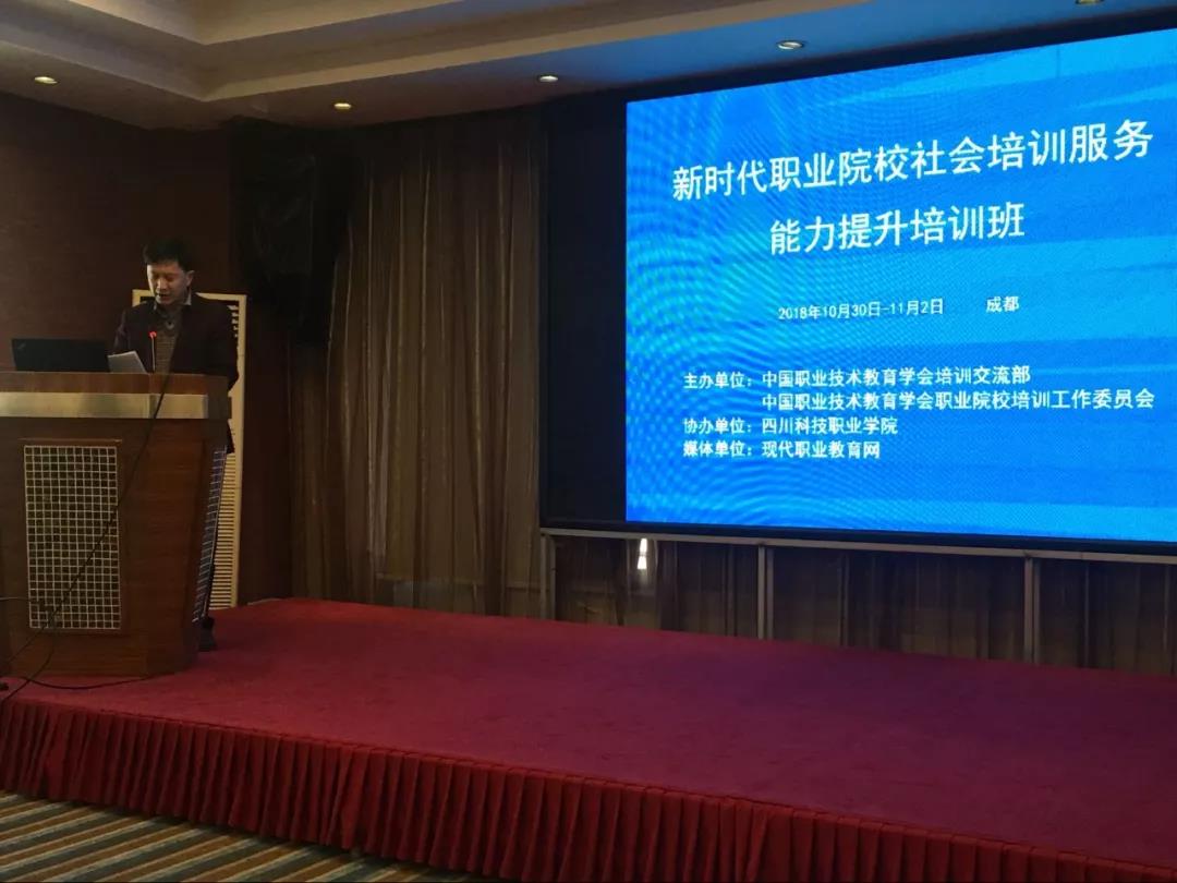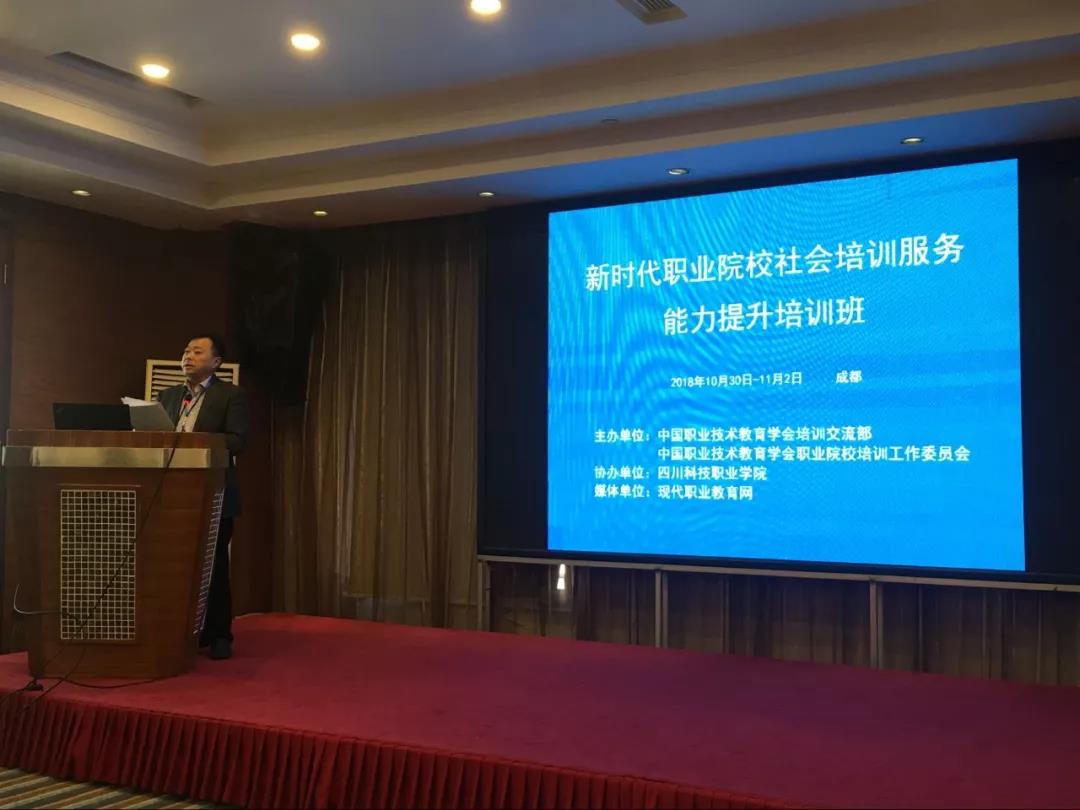 2018年10月30日—11月2日,由中国职业技术教育学会培训交流部、中国职业技术教育学会职业院校培训工作委员会举办的新时代职业院校社会培训服务能力提升培训班,在成都成功举办。会议主要讲述服务产业怎样融入行业对接院校,如何提升服务经济社会发展的能力和打开社会服务开新局。JYPC全国职业资格考试认证中心主任、江苏省高等教育学会副会长王庆运,在此次培训会议中发表了交流演讲。